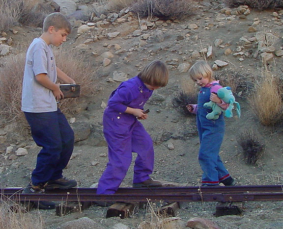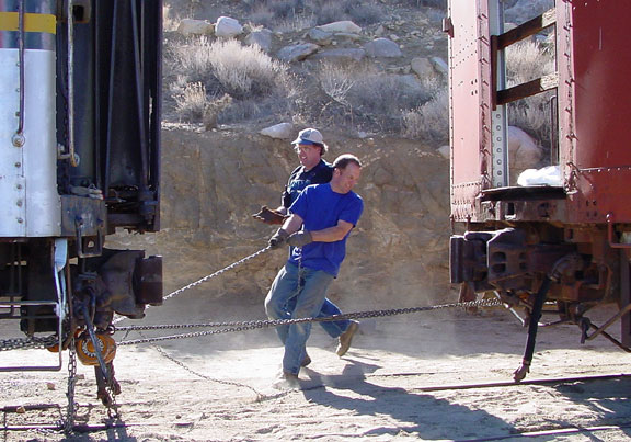 Pullman car progress is steady as well. The six upper berths, purchased through the generous donations of several of our members, have been moved into the car and await installation. Thanks to Tom Arnold who donated three original Pullman folding sinks for the roomettes. Thanks also go to Bob Murray, who put on long-term loan a semi-circular bar for our use in the Red Oak. A general clean up of the interior is under way thanks to the efforts of Rita Allan. Large amounts of trash and effluvium have been removed from the interior. Soon the car may be used as a lounge for dining patrons and sleeping quarters for members and crew. On January 5th a contingent manned by Tom Arnold, new member Andrew Moore, and myself moved the Pullman against the Dining Car utilizing a great deal of ingenuity and stamina. Tom nearly single-handedly removed the excess track behind the Pullman, wielding a sledgehammer with wild abandon! Andrew proved that you could cut 60-pound rail with a Sawzall! Go figure! Thanks also to Andrew’s wife Sue, who tirelessly entertained the kids during the workday with hiking, G-Scale railroading, and myriad other activities! Thanks Sue!