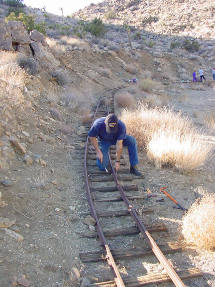 On the Grand Scale Division front, my good friend, the aforementioned Rick Mugele has been busy working up a preliminary 15" gauge track location plan based on the topo found in the depot library. This plan is now complete and available for viewing. Rick, a locomotive engineer for the BNSF, spent earlier years as a civil engineer and surveyor for the National Park Service. He is also an authority on the history of logging and mining railways of the Sierra Nevada. Our JT&S 15" gauge will resemble something of a mining "tram" reminiscent of the turn-of-the-century operations such as the Gilpin Tram, or the Argentine Central. The next phase of GSD construction is the complete removal of the existing loop trackage and relocation of those materials to the shelf behind the standard gauge cars. This will facilitate the re-grading of the loop into a broader and even radius. Beginning the tracklaying behind the standard gauge cars will allow us a viable starting point without having to construct the large bridge at this time. When we do build the bridge over the big wash, we can relay the track around the loop. Ken Pimlott, Nick Pimlott and Ken Eells have all been taking part in the track removal, Thanks guys!